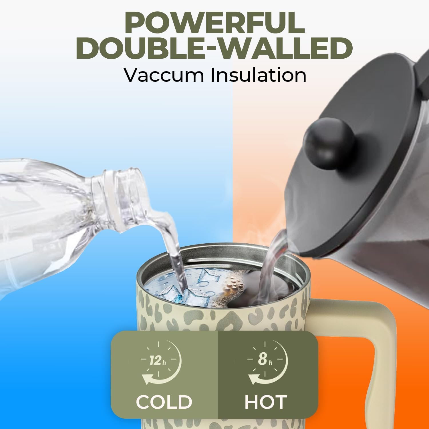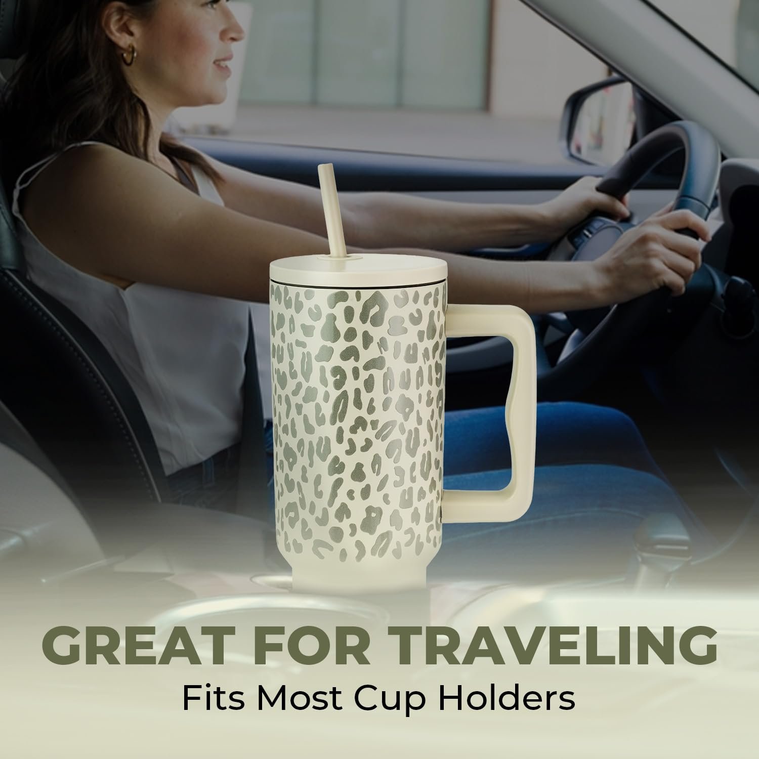 1200ML Stainless Steel Tumbler with Lid and Straw – Beige Leopard
