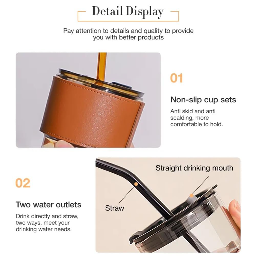 Enjoy your drinks in style with the DOCAT premium glass tumbler. Comes with lid, straw, and anti-slip leather sleeve—perfect for hot and cold beverages.