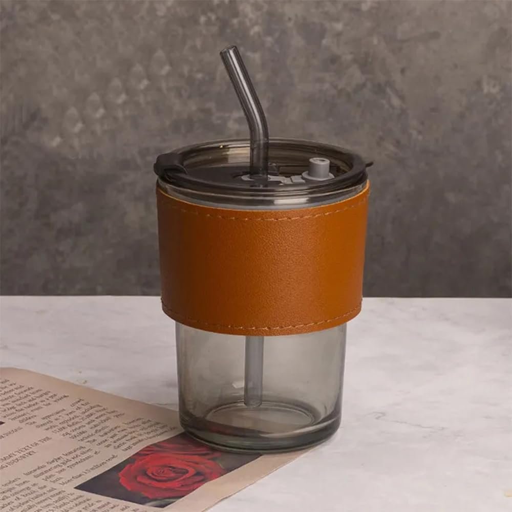 DOCAT Premium Glass Tumbler with Lid, Straw & Anti-Slip Leather Sleeve (435ml)